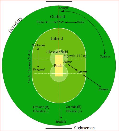 • खेळपट्टीभोवती ३० गज (२७.४३ मीटर) अंतरावर एक वर्तुळ आखले जाते, ज्याला “इनर सर्कल” म्हणतात.